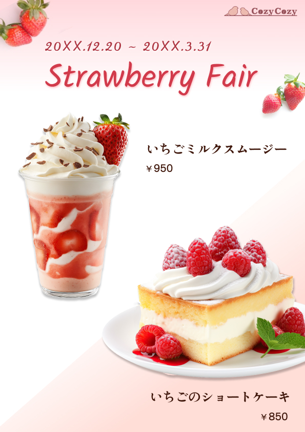 季節限定メニューに合わせ、いちごフェアの告知チラシを制作。