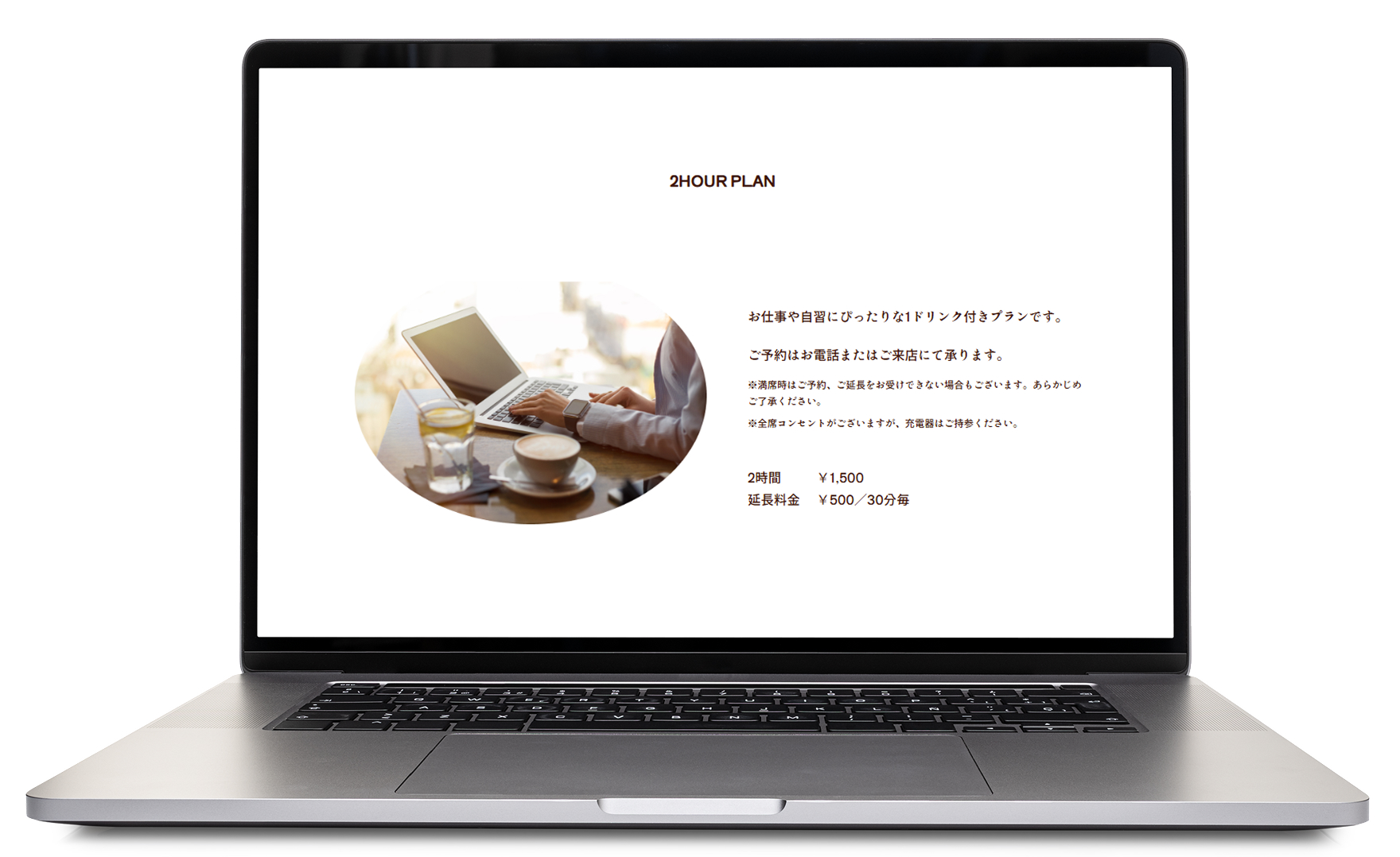 PC作業や勉強をしたい人も気兼ねなく滞在できるように2hour planを設け、居心地の良さが伝わる構成を意識した。