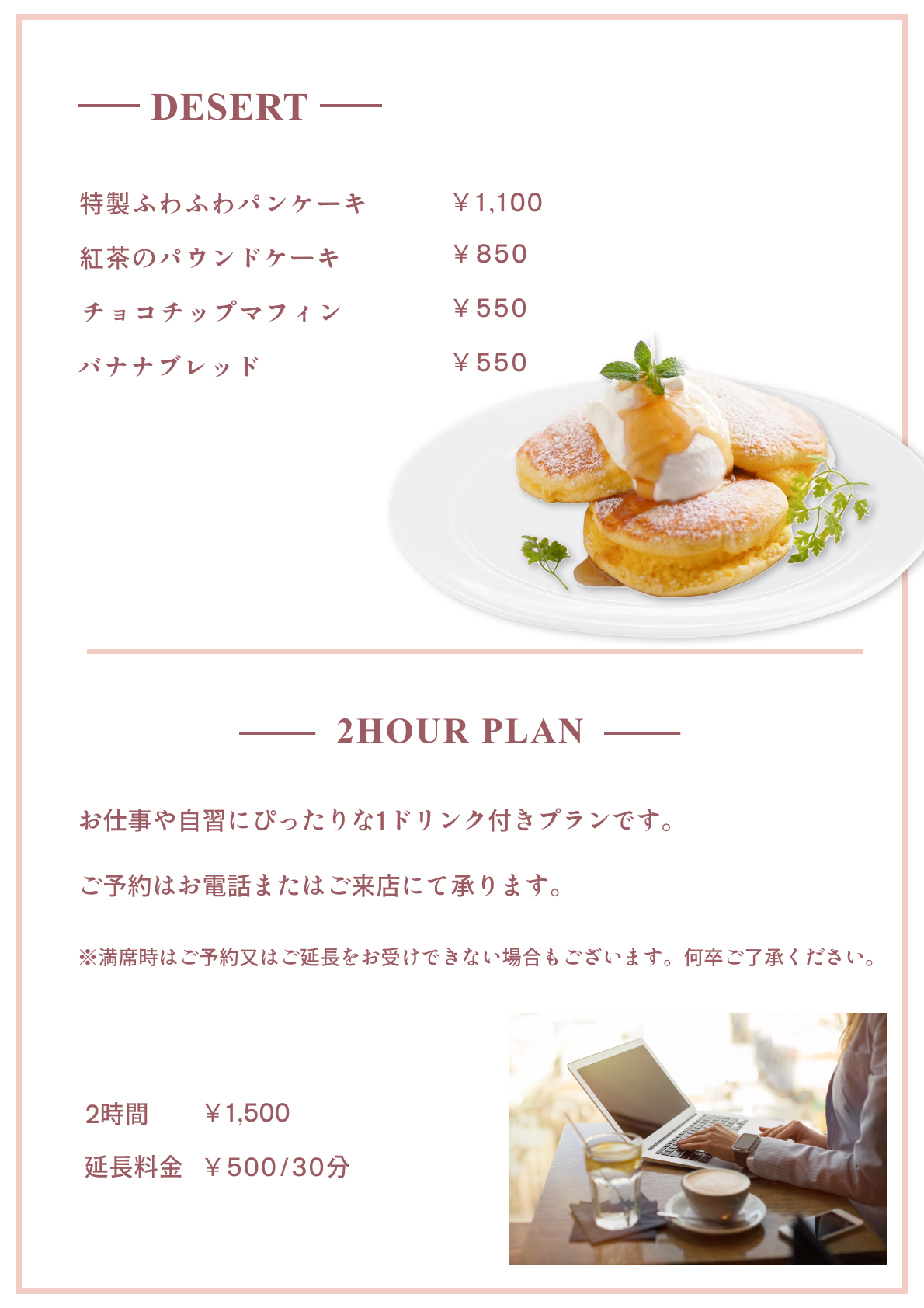 - 全席コンセント座席の1ドリンク付き2時間プランを用意。